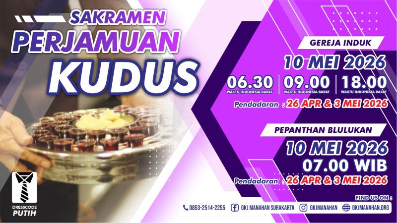 Ibadah Minggu Paskah III GKJ Manahan pada Minggu, 19 April 2026 pukul 06.30 WIB, 08.30 WIB dilaksanakan secara Online (Live Streaming) dan Onsite (Tatap Muka), sedangkan Ibadah Pukul 18.00 WIB dilaksanakan secara Onsite (Tatap Muka).