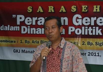 Bp. Aria Bima menyampaikan bahwa anggota DPR sekarang tidak membahas hal-hal fundamental, namun justru membahas hal-hal yang tidak penting seperti pembangunan gedung, kenaikan gaji, dan biaya perjalanan keluar negeri. Setidaknya itulah yang ditampilkan oleh media massa. Lebih lanjut dalam penjelasannya, beliau juga menanyakan peranan gereja selama ini. Tidak banyak gereja yang menyiapkan kader-kader politik, sehingga putusan undang-undang atau peraturan-peraturan yang mungkin tidak memperhatikan kelompok minoritas terus saja lolos. Kehadiran tokoh-tokoh nasional yang memegang hak asasi manusia untuk bebas beragama sangat dibutuhkan saat ini.